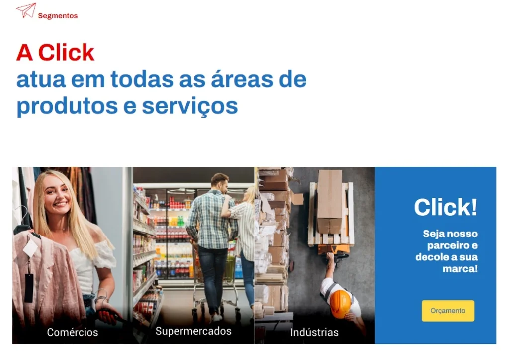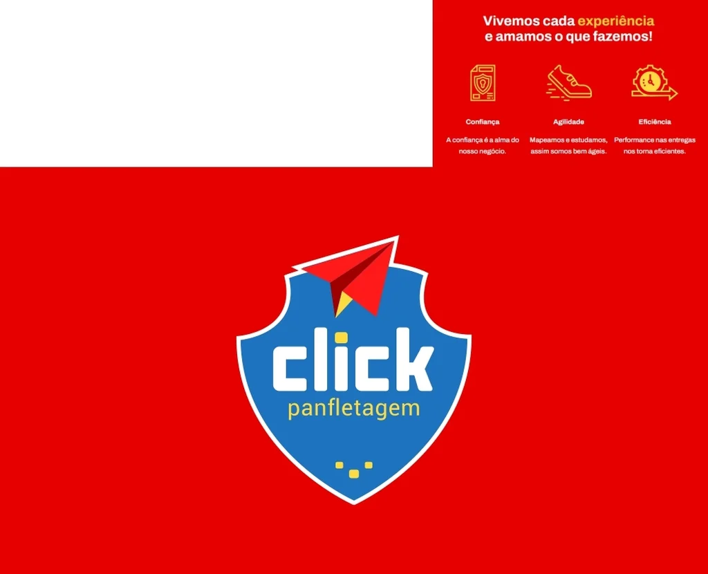 Criamos e agora redesenhamos o logo da Click apresentando-o com formato moderno. O conceito do avião de papel simboliza sua velocidade e performance nas entregas dos materiais.