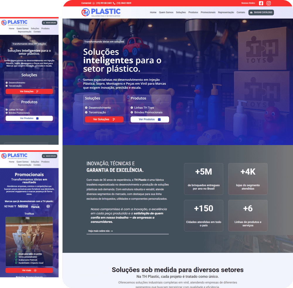 Na Agência Dórz Marketing & Branding, transformamos o complexo universo industrial em uma presença digital clara e autoritária. O projeto TH Plastic exigiu um Site Institucional e Comercial completo que comunicasse a amplitude de soluções para o setor plástico e a vasta experiência da indústria.